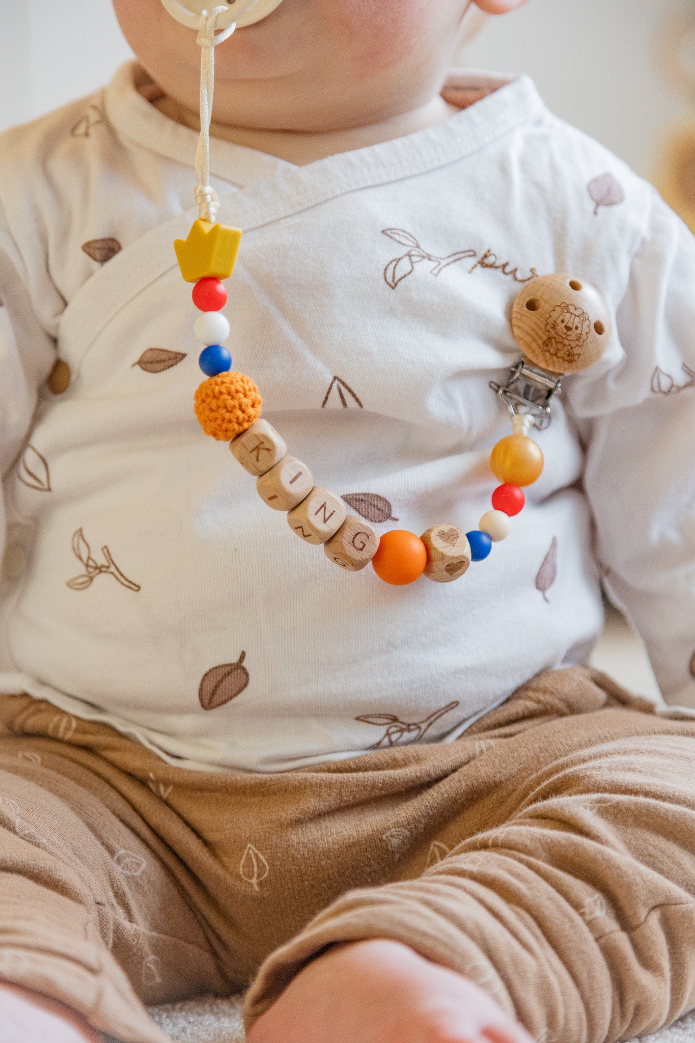 Het speenkoord KING bestaat uit siliconen en houten kralen. Deze kralen zijn naar onze mening het meest geschikt voor het maken van speenkoordjes. Ze zijn superlicht en de siliconen kralen zijn ook nog eens heerlijk zacht. Ze bevatten bovendien geen schadelijke stoffen. De siliconen kralen zijn eveneens 100% BPA-vrij, gif-vrij, lood-vrij, PVC-vrij en CE gecertificeerd. Tenslotte zijn ze ook nog eens getest conform de Europese veiligheidsnorm EN71.
